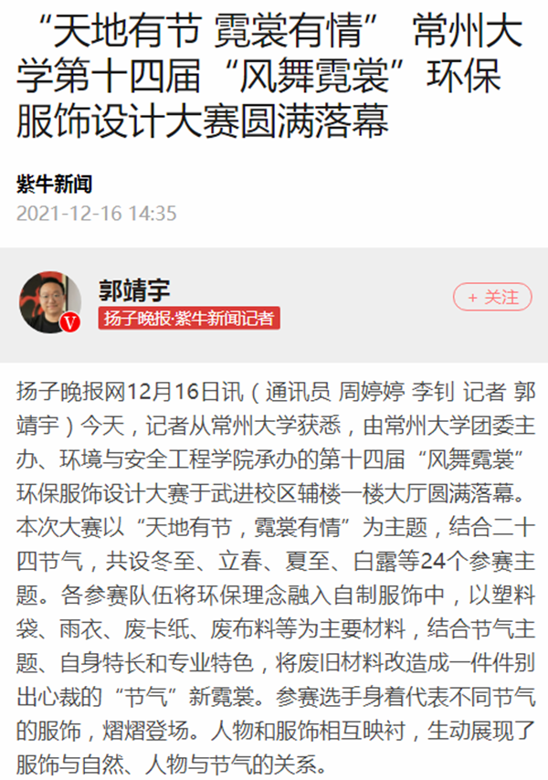 今天,记者从37000vip威尼斯获悉,由37000vip威尼斯团委主办、环境与安全工程学院承办的第十四届“风舞霓裳”环保服饰设计大赛于武进校区辅楼一楼大厅圆满落幕。本次大赛以“天地有节,霓裳有情”为主题,结合二十四节气,共设冬至、立春、夏至、白露等24个参赛主题。各参赛队伍将环保理念融入自制服饰中,以塑料袋、雨衣、废卡纸、废布料等为主要材料,结合节气主题、自身特长和专业特色,将废旧材料改造成一件件别出心裁的“节气”新霓裳。参赛选手身着代表不同节气的服饰,熠熠登场。人物和服饰相互映衬,生动展现了服饰与自然、人物与节气的关系。